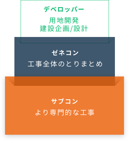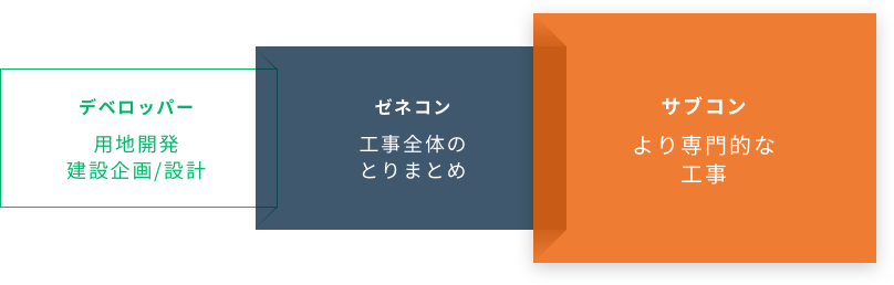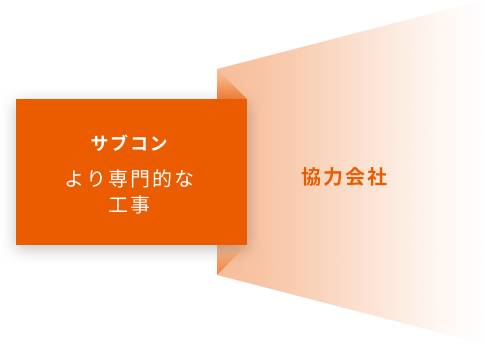 ゼネコンは実際に工事をする機能を持っていないことが多いため、施工全体の工程を細分化し、それぞれの専門技術を持ったサブコンと呼ばれる企業に工事を分担します。