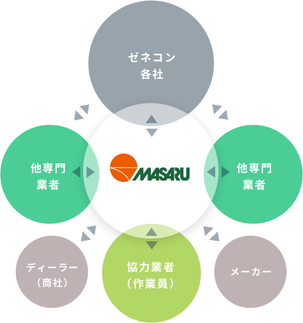 そんなサブコンの中で、建物を風雨から守るための「シーリング・防水」分野の工事を行うのが株式会社マサルです。 建物をつくるという大きなプロジェクトが細分化された中にも、その専門技術が成り立つ背景にはさまざまなサブコンが存在しています。 施工プロジェクト全体を管理するゼネコンと連携をとりながらも、マサルが持つ高度な技術力を形にするための協力会社とのやり取りが非常に重要になります。施工管理として協力会社と連携しながら、安定的かつ円滑に施工を進めていきます。