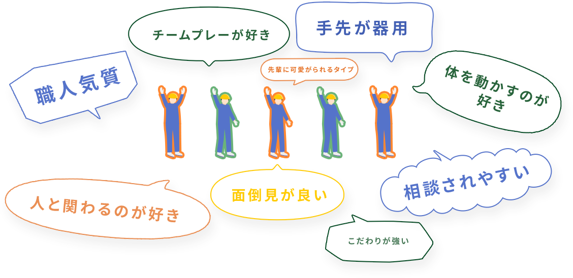 優秀施⼯者国⼟交通⼤⾂顕彰(通称建設マスター)を有し、優秀な技術・技能を持った社員がみなさんの育成・指導に当たります。